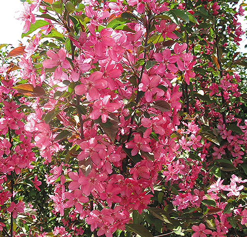 粉色海洋落葉喬木,樹干挺直,樹冠自然成形,樹高約10米,新葉紫紅色,邊緣具圓鈍鋸齒,花色為深粉色或紫紅色,花蕾大,花期5月,果實(shí)形紅色,果實(shí)小而密,掛果期長(zhǎng),可掛至冬季。抗寒性極強(qiáng),哈爾濱,黑河地區(qū)表現(xiàn)良好。