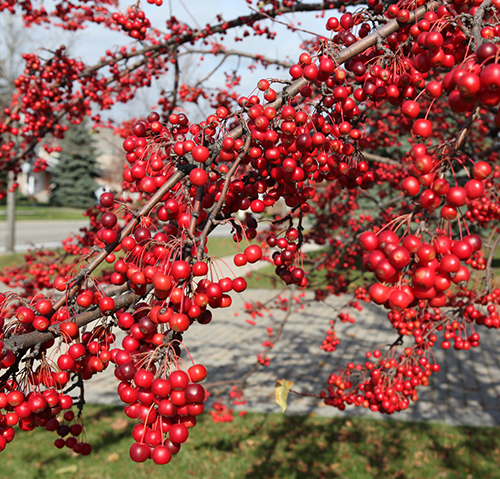 普特落葉喬木,樹干挺直,株高9米左右,樹冠呈圓球狀,四月下旬盛花,花蕾深紅色,初放花朵亮洋紅色,花瓣圓,形似茶花;花色逐漸變淺。新葉酒紅色,逐漸變?yōu)榫G色,幼果深紫紅色,果實(shí)成熟變成明亮的紅色,秋季果實(shí)黃金的橙色,宿寸1-2月??剐詮?qiáng),長勢旺盛,是良好的園林綠化樹種,沈陽地區(qū)種植表現(xiàn)良好。