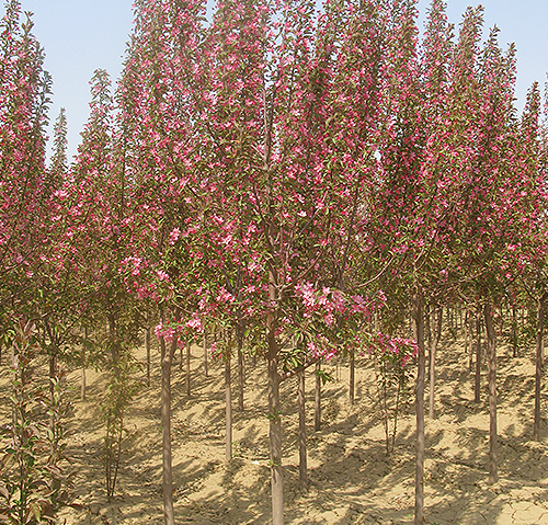 普特落葉喬木,樹干挺直,株高9米左右,樹冠呈圓球狀,四月下旬盛花,花蕾深紅色,初放花朵亮洋紅色,花瓣圓,形似茶花;花色逐漸變淺。新葉酒紅色,逐漸變?yōu)榫G色,幼果深紫紅色,果實(shí)成熟變成明亮的紅色,秋季果實(shí)黃金的橙色,宿寸1-2月??剐詮?qiáng),長(zhǎng)勢(shì)旺盛,是良好的園林綠化樹種,沈陽(yáng)地區(qū)種植表現(xiàn)良好。