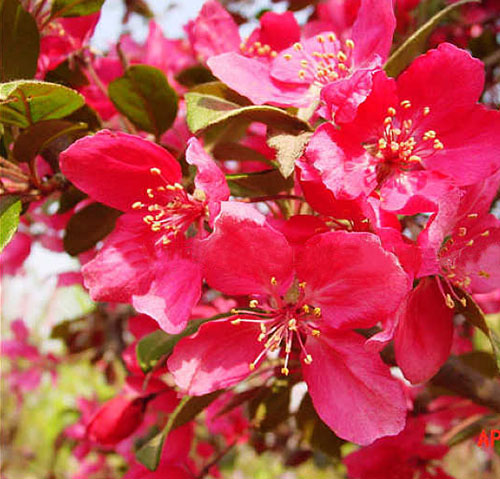 美加歐1號該品種為多次雜交新品種,落葉喬木,樹冠為直立橢圓形,幼苗挺拔,長勢旺盛?;ㄆ?月,花蕾深粉色,新葉和枝條酒紅色,成熟葉片背面呈紅色絨毛狀,正面呈亮深綠偏紅,葉色獨特,風(fēng)中搖曳非常漂亮,幼果紅色,逐漸轉(zhuǎn)為亮紅色,宿果至次年春季,適應(yīng)性強,極其耐寒,是良好的園林綠化樹種,哈爾濱地區(qū)種植表現(xiàn)良好。