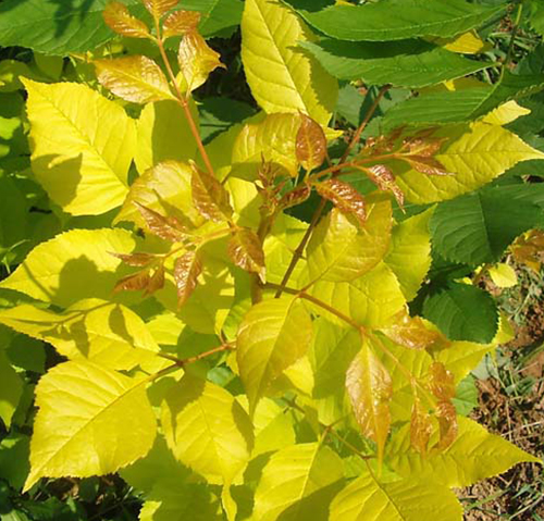 金葉白蠟高大落葉喬木,是白蠟樹一個栽培變種,枝葉稠密,樹形優(yōu)美,樹皮淡黃褐色;小枝光滑無毛,卵狀或橢圓形,尖端漸尖,基部狹,不對稱,緣有齒及波狀齒,表面無毛;花萼鐘狀,無花瓣;花期4-5月。七月底以前葉片全部金黃,七月底以后的整個生長季節(jié)嫩葉金黃,逐漸變?yōu)辄S綠色,;老葉變?yōu)榫G色跟襯托出綠葉黃花格外突出。該品種可三季觀金葉,抗性強,耐寒、耐寒、不但可以做行道樹、孤植成景,而且還可以做綠籬和修剪造型,是觀賞價值極高的觀賞園林綠化樹種,沈陽地區(qū)種植表現(xiàn)良好。