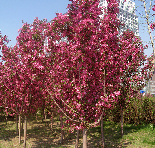 粉色海洋落葉喬木,樹(shù)干挺直,樹(shù)冠自然成形,樹(shù)高約10米,新葉紫紅色,邊緣具圓鈍鋸齒,花色為深粉色或紫紅色,花蕾大,花期5月,果實(shí)形紅色,果實(shí)小而密,掛果期長(zhǎng),可掛至冬季??购詷O強(qiáng),哈爾濱,黑河地區(qū)表現(xiàn)良好。