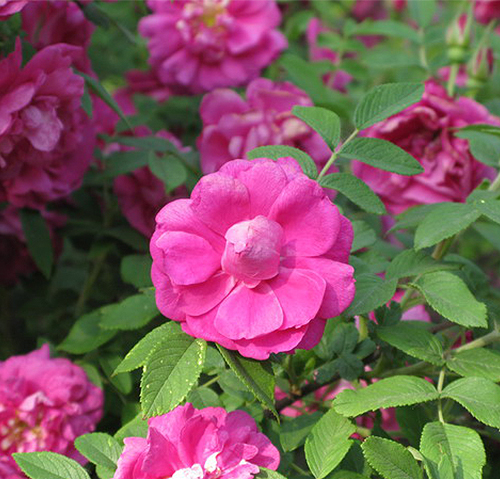 紅刺玫小葉較大,通常5~7;花粉紅,花較大,單瓣,平頂傘房花序;果實(shí)較小,少種子或無種子。系野薔薇的一個(gè)變種,在上海表現(xiàn)為半常綠灌木。
